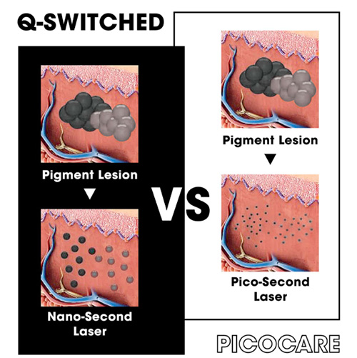 Laser pikosekundowy wykorzystuje wzrośnie skóry, aby zaznaczyć warstwy skóry skóry do aktywowania produkcji elastyny i kolagenu, w porównaniu z tradycyjnymi zabiegami laserowymi, które mają tendencję do spalania skóry, a następnie zmuszania jej do zagojenia.
