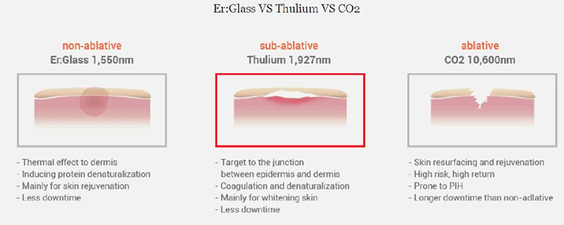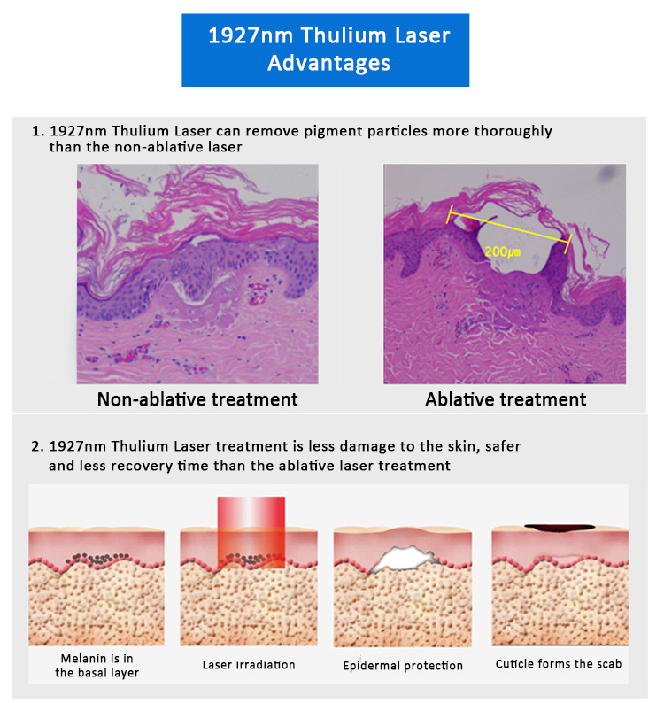 Ponadto laser Thulium z 1927 nm jest doskonałym sposobem leczenia melasmy, zmian pigmentowych, zmarszczek, dużych porów i bardziej poprzez regulowaną intensywność energii i czas trwania impulsu jednocześnie podczas zabiegu. W celu leczenia pigmentacji na naskórkowej warstwie podstawowej, ta sublacyjna z układu laserowego Thulium byłaby najlepszym wskazaniem, ponieważ istnieje wiele melanocytów i melaniny na naskórkowej warstwie podstawowej.