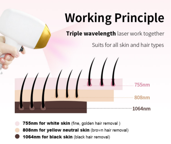 Tradycyjne laserowe usuwanie włosów zwykle wykorzystuje laser o długości fali. Różne długości fali laserowej mają różne możliwości absorpcji dla głębokości włosów i pigmentów skóry, więc pojedynczy laser długości fali może nie dawać najlepszego efektu dla wszystkich rodzajów włosów i skóry, długości fali 755 nm: głównie działa na włosy w pobliżu powierzchni skóry, odpowiednie dla mieszającej się włosów.