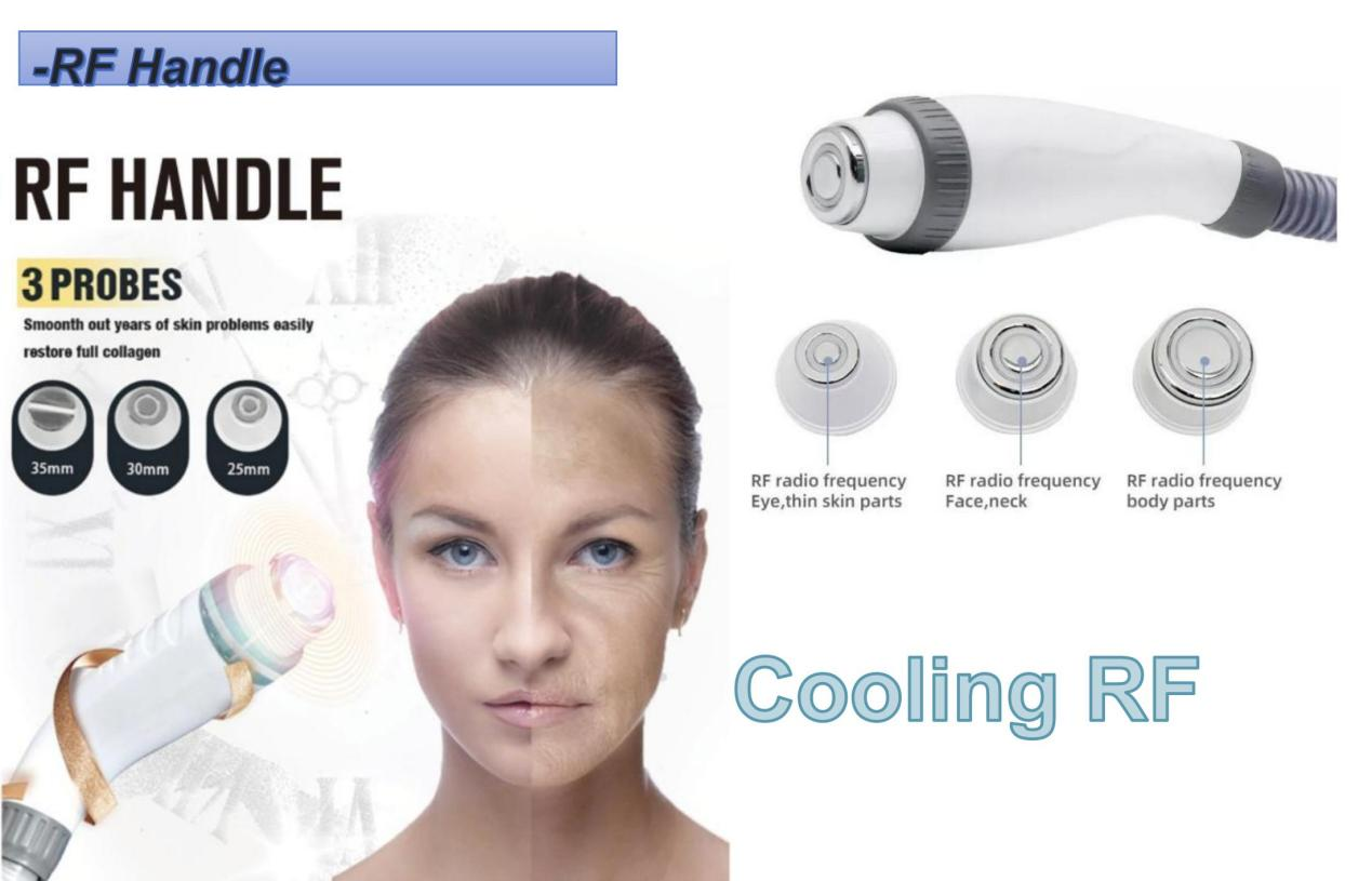 RF (częstotliwość radiowa): stymuluje produkcję kolagenu do zaostrzenia skóry, redukcji zmarszczek i konturowania ciała. System chłodzony wodą zapewnia komfort i bezpieczeństwo podczas zabiegu.