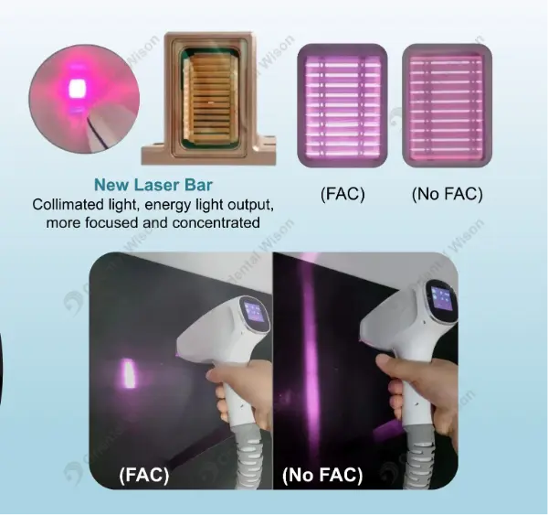 Najwyższa jakość wiązki: Zmniejszając rozbieżność każdej diody laserowej, wiązka staje się bardziej precyzyjna, co pozwala na szybsze zabiegi i większą skuteczność.